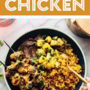 This chicken is yummy! We ate it over mixed greens with a citrus vinaigrette. I did marinate the chicken for a couple of hours — it worked well for me to mix up the sauce and cut the chicken while my toddler was napping, and since that prep work was done dinner came together super fast!