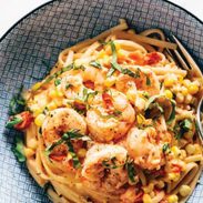 Shrimp, pasta, corn, and tomatoes on a plate.