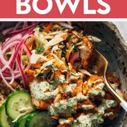 - Bowl Assembly. Layer your quinoa, crispy chicken, slaw, cucumbers, pickled red onions, and then don’t be shy with that mint sauce over the top!