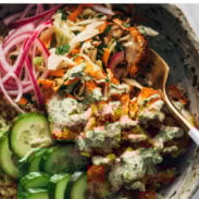 - Serve bowls with quinoa, slaw, cucumbers, pickled red onions, and sauce over the top. It’s crispy, salty, spicy, briney, cool, and creamy. DROOL.