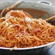 - Combine the noodles and the sauce in a large pot or mixing bowl. Top with grated cheese. At Cherne they grate a processed cheese similar to Velveeta and let it melt into the top layer of the spaghetti.