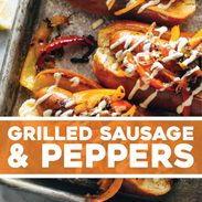 Grilled sausage and peppers with aioli on a sheet pan.
