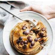 With peanut butter and chocolate chips and a little bit of maple syrup, which is just how I ate them growing up, post-swim-team practice, sometimes mushed together into a big pile of “scrambled pancakes” because me and my teenage squad didn’t know what we were even doing with a pan and a spatula, but we knew we needed those chocolate-kissed carbs in our systems immediately, stat, SOS, even if it meant squished together into pan remnants topped with sprinkles and chocolate chips and syrup.