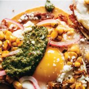 The fried egg is just your standard cheese-skirt fried egg (which is really having a moment right now!) but we’re going elote-style with the whole thing – adding some roasted corn, cotija, and cilantro – and finishing with a tangle of pickled red onions and a happy little thwap of green sauce.