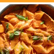 This roasted red pepper pasta recipe is so delicious! My husband and I loved it! As you suggested, I served it with wild shrimp (from Trader Joe’s that I sauteed with its natural juices and crushed garlic) and steamed broccolini. AMAZING! Thank you so much for a wonderful, easy and fancy recipe!