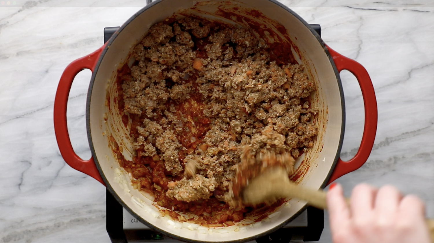 - Add your “meat” to the pan – once it mixes in and starts cooking, it should start to resemble chili meat. Let the “meat” cook for 10 minutes or so to soften the vegetables. Season with salt.