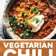 Toppings: For vegetarian chili – sour cream and cheddar or queso fresco. For vegan chili – cilantro, avocado, pickled onion or jalapeno, radishes, tortilla chips.